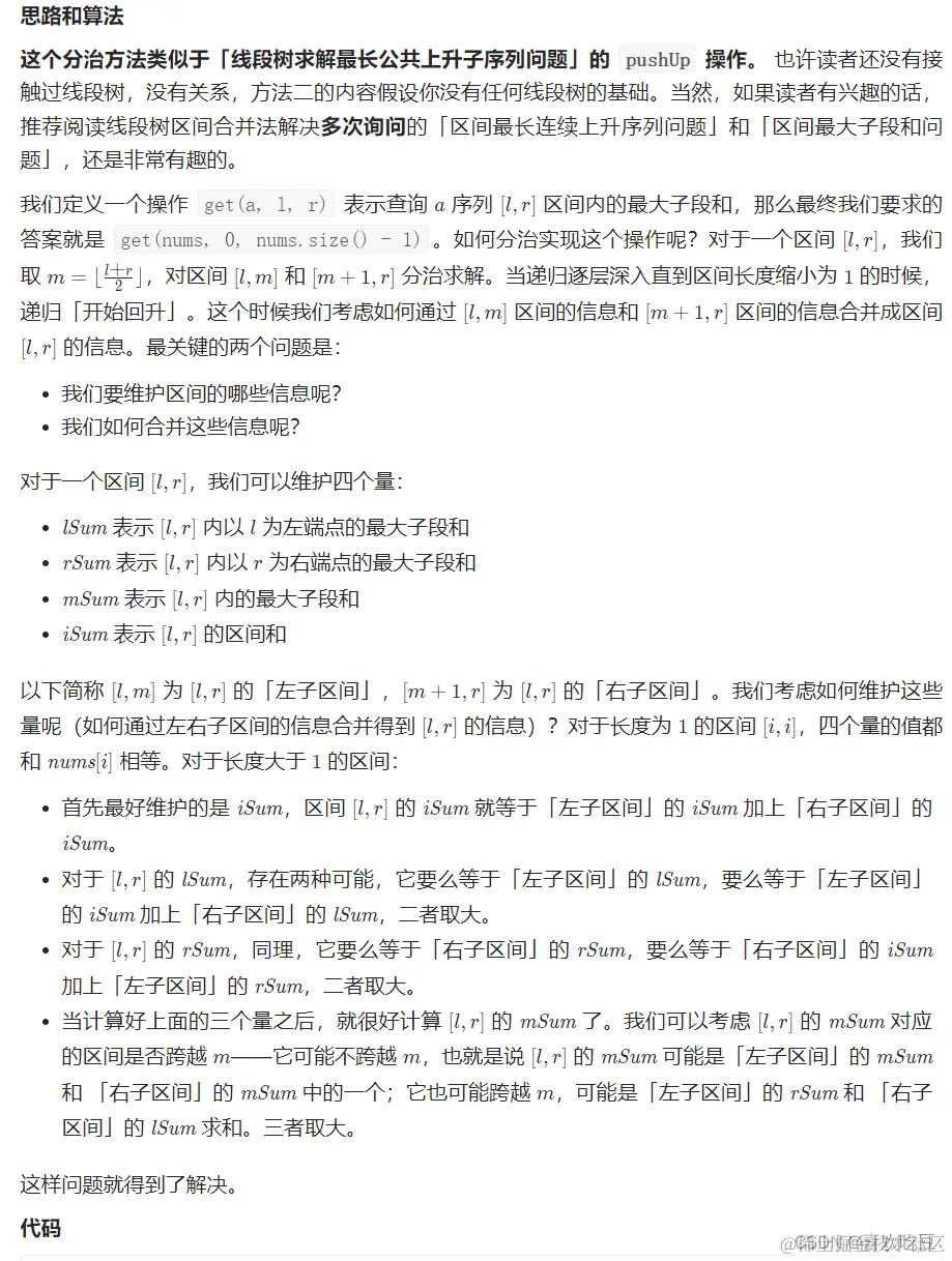 我们定义一个操作 get(a, l, r) 表示查询 a 序列 [l,r] 区间内的最大子段和,那么最终我们要求的答案就是 get(nums, 0, nums.size() - 1)。如何分治实现这个操作呢?对于一个区间 [l,r],我们取 m ,对区间 [l,m][l,m] 和 [m+1,r][m+1,r] 分治求解。当递归逐层深入直到区间长度缩小为 11 的时候,递归「开始回升」。这个时候我们考虑如何通过 [l,m][l,m] 区间的信息和 [m+1,r][m+1,r] 区间的信息合并成区间 [l,r][l,r] 的信息。最关键的两个问题是: