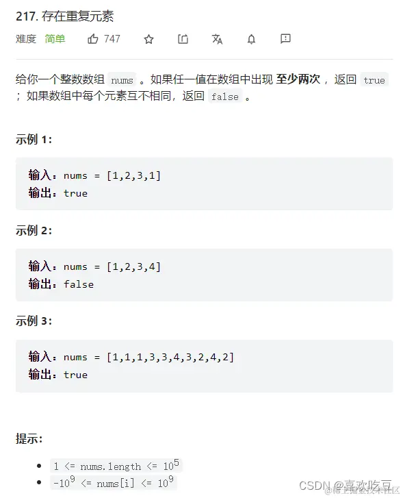 217. 存在重复元素 - 力扣(LeetCode)https://leetcode.cn/problems/contains-duplicate/