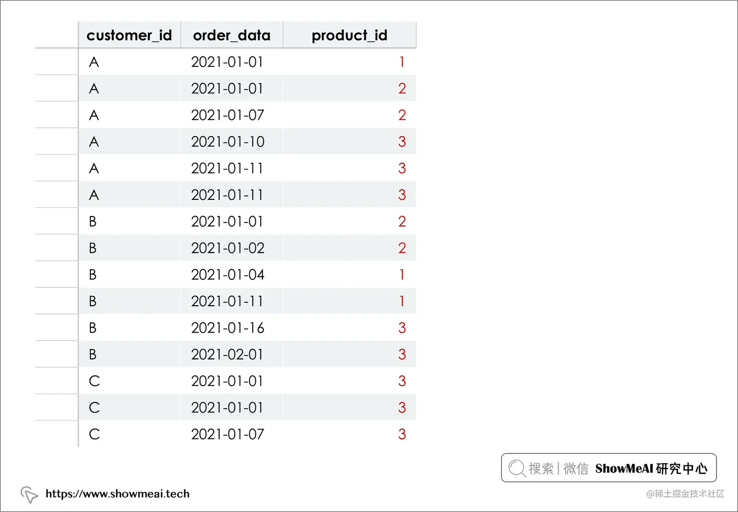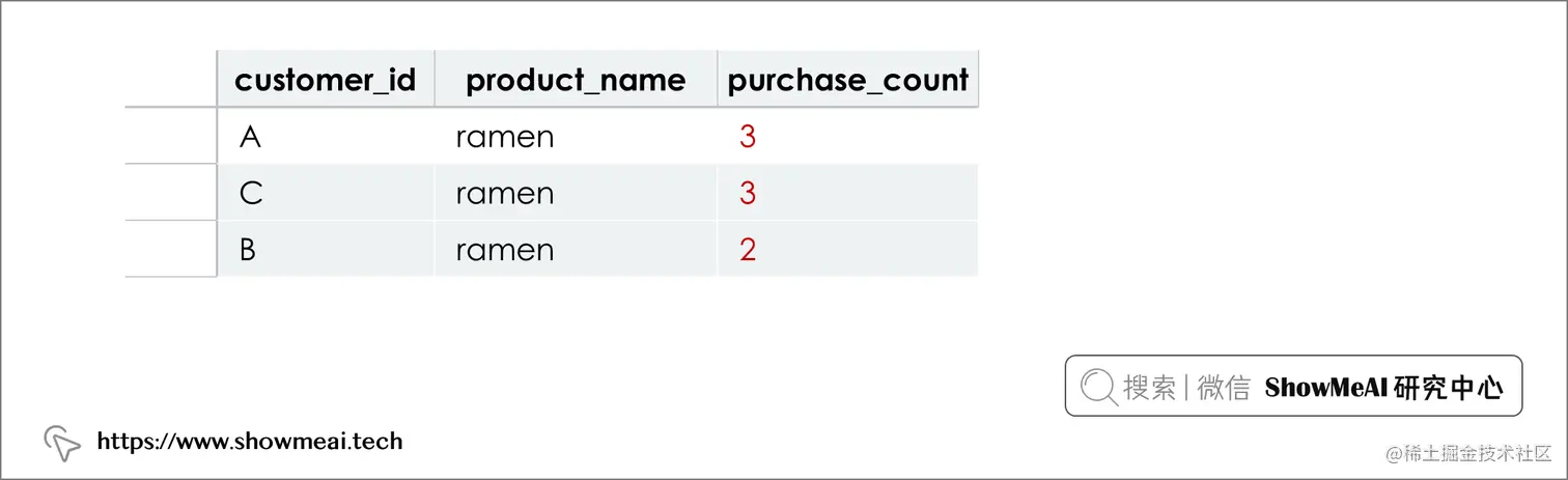 在这个问题中,我们要对客户购买每种产品的次数进行排名,因此使用窗口函数 rank,按customer_id划分,按客户购买产品的次数(计数)排序。对应的SQL如下: