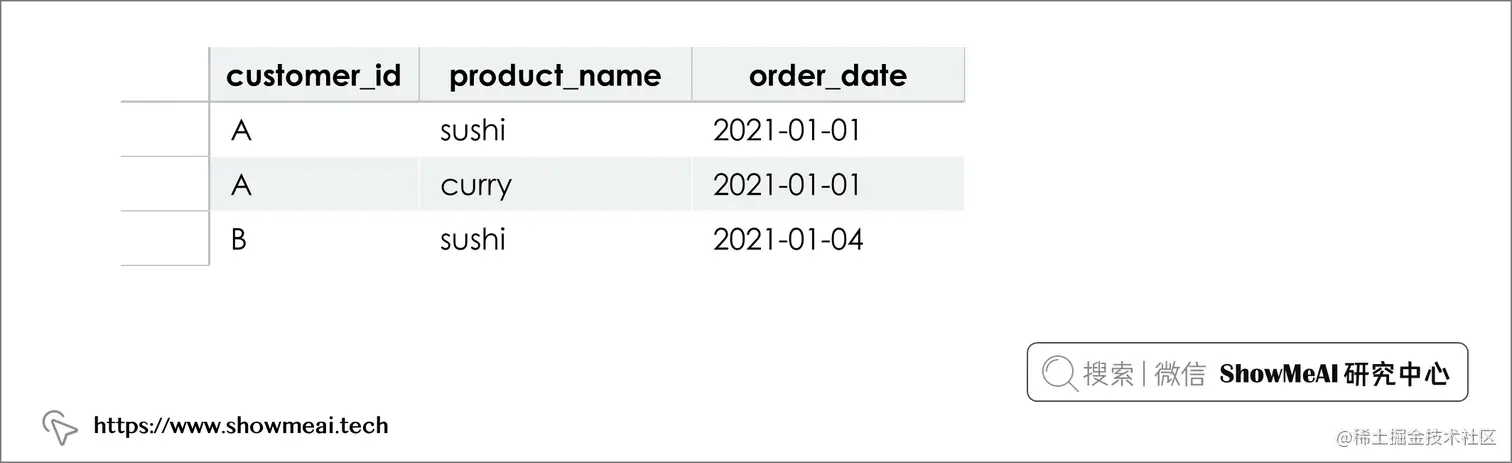 同上一个问题,我们需要用到所有 3 个表。要查询客户在成为会员之前购买的商品,订单日期需要小于加入日期。使用窗口函数通过对customer_id进行划分并按order_date对其进行排序,对第一个购买日期进行降序排列。最终的SQL如下: