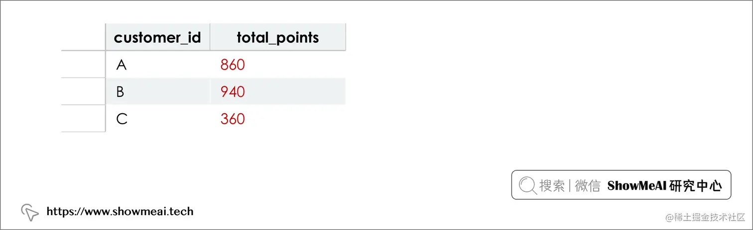 这个问题用到sales和menu两张表。我们使用case语句将积分分配给客户购买的商品,并对积分进行统计求和得到每位顾客的积分数。对应的SQL如下: