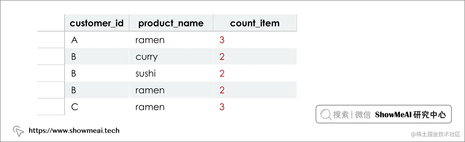 第2小问是问所有顾客在这个最热门的菜上下单的次数,我们在上述SQL的基础上加上customer_id进行统计。