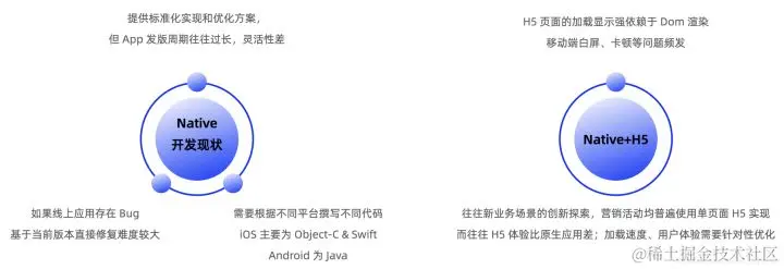 相信很多大佬用 Native 或者 Hybrid 的模式开发都深有体会,原生开发模式需要多个平台投入巨大的时间和人力成本进行开发,而多人多模块协作和跨团队协作也加大了工作的复杂度,导致 App 发版周期长,无法跟上产品更新节奏,灵活性较差。