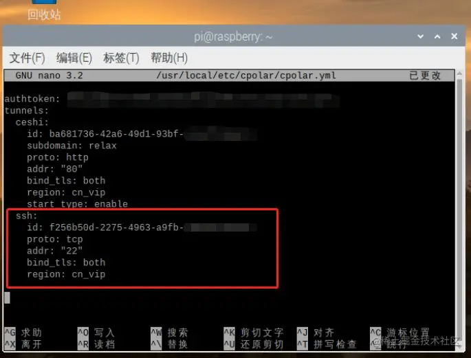 此处需要注意,nano与/usr之间为空格。以编辑模式打开cpolar的配置文件(cpolar配置文件是程序正常运行的基础,没事千万别改着玩)。