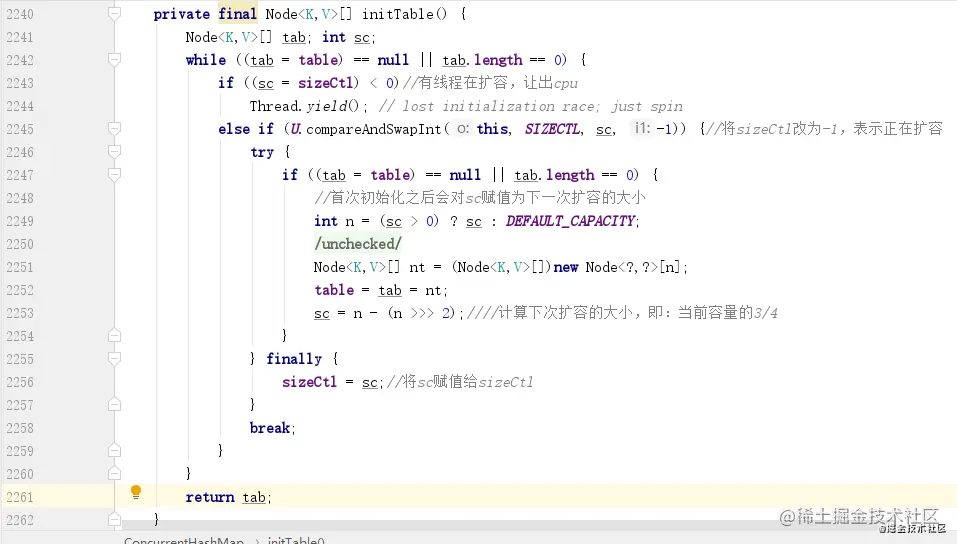 知道了这个变量的含义,上面的方法就好理解了,第二个分支采用了 CAS 操作,因为 SIZECTL 默认为 0,所以这里如果可以替换成功,则当前线程可以执行初始化操作,CAS 失败,说明其他线程抢先一步把 sizeCtl 改为了 -1。扩容成功之后会把下一次扩容的阈值赋值给 sc,即 sizeClt。