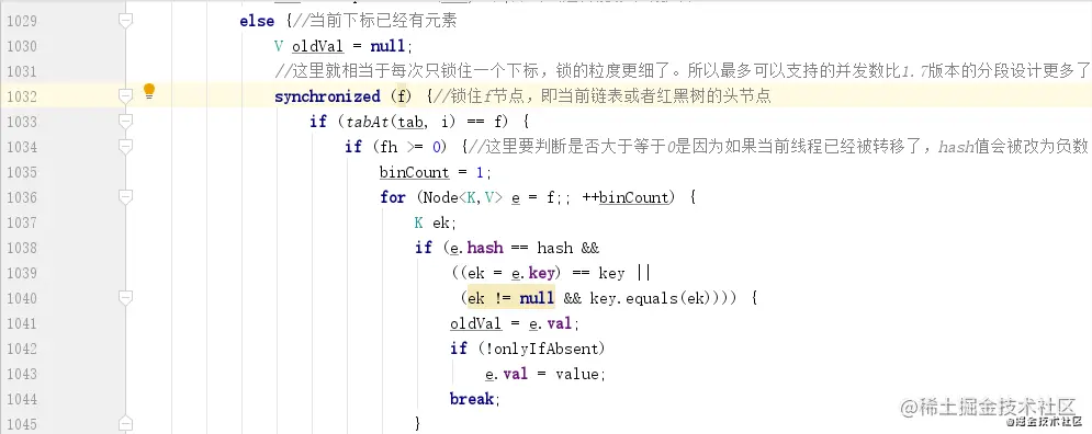 如何实现线程的安全性?加锁。但是这个锁应该怎么加呢?在 HashTable 中,是直接在 put 和 get 方法上加上了 synchronized,理论上来说 ConcurrentHashMap 也可以这么做,但是这么做锁的粒度太大,会非常影响并发性能,所以在 ConcurrentHashMap 中并没有采用这么直接简单粗暴的方法,其内部采用了非常精妙的设计,大大减少了锁的竞争,提升了并发性能。