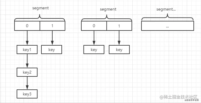 - 通过 hash 值和 段数组长度-1 进行位运算确认当前 key 属于哪个段,即确认其在 segments 数组的位置。