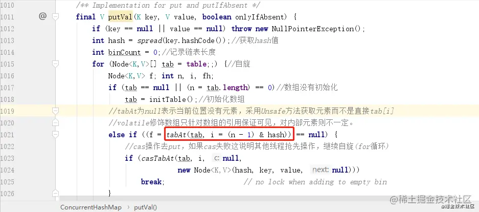 ConcurrentHashMap 中存储数据采用的 Node 数组是采用了 volatile 来修饰的,但是这只能保证数组的引用在不同线程之间是可用的,并不能保证数组内部的元素在各个线程之间也是可见的,所以这里我们判定某一个桶是否有元素,并不能直接通过下标来访问,那么应该如何访问呢?源码给你答案: