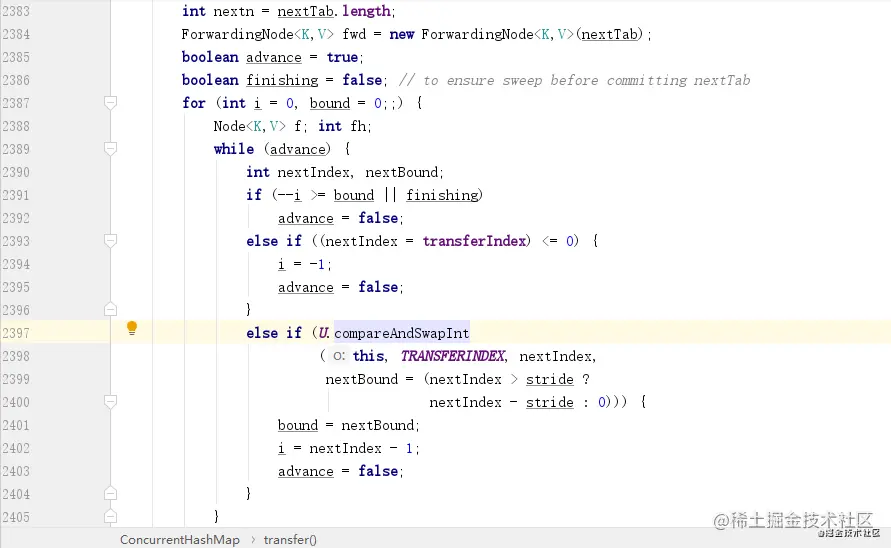PS:因为 nextBound=0,所以 CAS 操作实际上也是把 transferIndex 变成了 0,表示当前扩容的数组下标已经全部分配完毕,这也是前面不满足扩容的第 5 个条件。