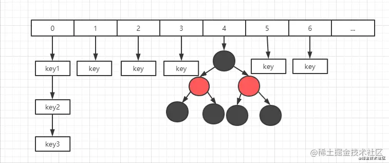 为了进一步优化性能,在 jdk1.8 版本中,对 ConcurrentHashMap 做了优化,取消了分段锁的设计,取而代之的是通过 cas 操作和 synchronized 关键字来实现优化,而扩容的时候也利用了一种分而治之的思想来提升扩容效率,在 JDK1.8 中 ConcurrentHashMap 的存储结构和 HashMap 基本一致,如下图所示: