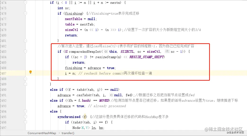 while 循环彻底结束之后,会进入到下面这个 if 判断,红框中就是当前线程自己完成了迁移之后,会将扩容线程数进行递减,递减之后会再次通过一个条件判断,这个条件其实就是前面进入扩容前条件的反推,如果成立说明扩容已经完成,扩容完成之后会将 nextTable 设置为 null,所以上面不满足扩容的第 4 个条件就是在这里设置的。