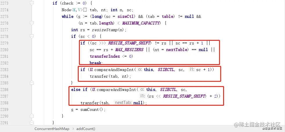接下来我们需要回到 addCount 方法,因为这个方法在添加元素数量的同时,也会判断当前 ConcurrentHashMap 的大小是否达到了扩容的阈值,如果达到,需要扩容。
