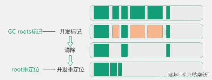roots标记:标记root对象,会StopTheWorld. 并发标记:利用读屏障与应用线程一起运行标记,可能会发生StopTheWorld. 清除会清理标记为不可用的对象. roots重定位:是对存活的对象进行移动,以腾出大块内存空间,减少碎片产生.重定位最开始会StopTheWorld,却决于重定位集与对象总活动集的比例. 并发重定位与并发标记类似.