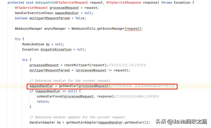 这个方法最关键的就是调用了 getHandler 方法,这个方法就是会获取到前面九大组件中的 HandlerMapping,然后进行反射调用对应的方法完成请求,完成请求之后后续还会经过视图转换之类的一些操作,最终返回 ModelAndView,不过现在都是前后端分离,基本也不需要用到视图模型,在这里我们就不分析后续过程,主要就是分析 HandlerMapping 的初始化和查询过程。