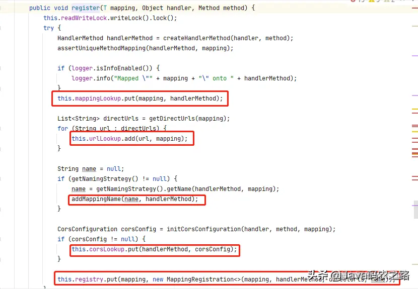 registerHandlerMethod 方法中会直接调用 AbstractHandlerMethodMapping 对象持有的 mappingRegistry 对象中的 regidter方法,这里会对 Controller 中方法上的一些元信息进行各种解析,比如参数,路径,请求方式等等,然后会将各种信息注册到对应的 Map 集合中,最终完成了整个初始化。