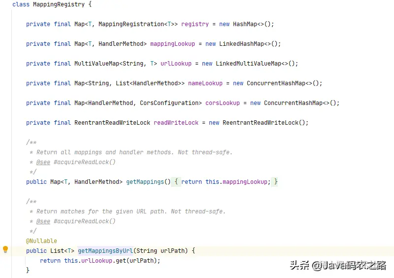 看这个对象其实很明显可以看出来,这个对象其实只是维护了一些 Map 对象,所以我们可以很容易猜测到,一定在某一个地方,将 url 和 HandlerMapping 或者 HandlerMethod 的映射关系存进来了,这时候其实我们可以根据 getMappingsByUrl 方法来进行反推,看看 urlLookup 这个 Map 是什么时候被存入的,结合上面的类图关系,一路反推,很容易就可以找到这个 Map 中的映射关系是
