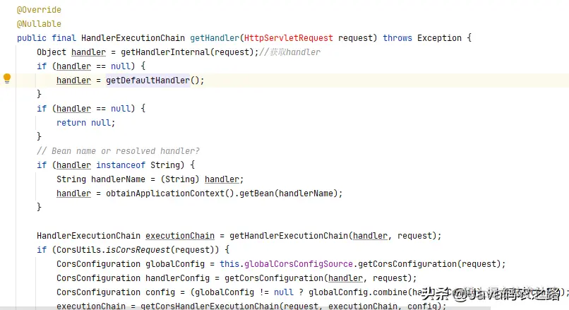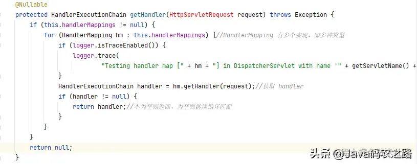 这个方法里面会遍历 handllerMappings,这个 handllerMappings 是一个 List 集合,因为 HandlerMapping 有多重实现,也就是 HandlerMapping 不止一个实现,其最常用的两个实现为