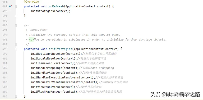 onRefresh() 方法就是 Spring MVC 初始化的最后一个步骤,在这个步骤当中会初始化 Spring MVC 流程中可能需要使用到的九大组件。