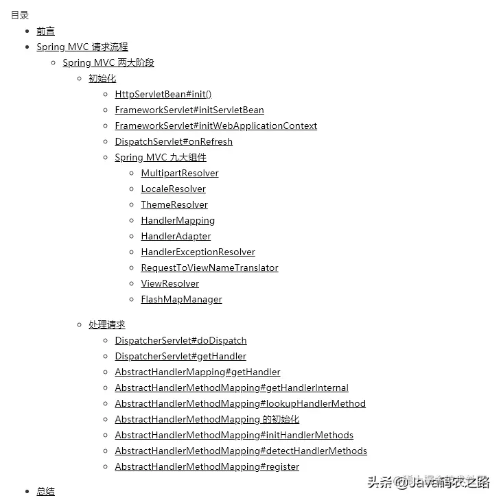 Spring MVC主要可以分为两大过程,一是初始化,二就是处理请求。初始化的过程主要就是将我们定义好的 RequestMapping 映射路径和 Controller 中的方法进行一一映射存储,这样当收到请求之后就可以处理请求调用对应的方法,从而响应请求。
