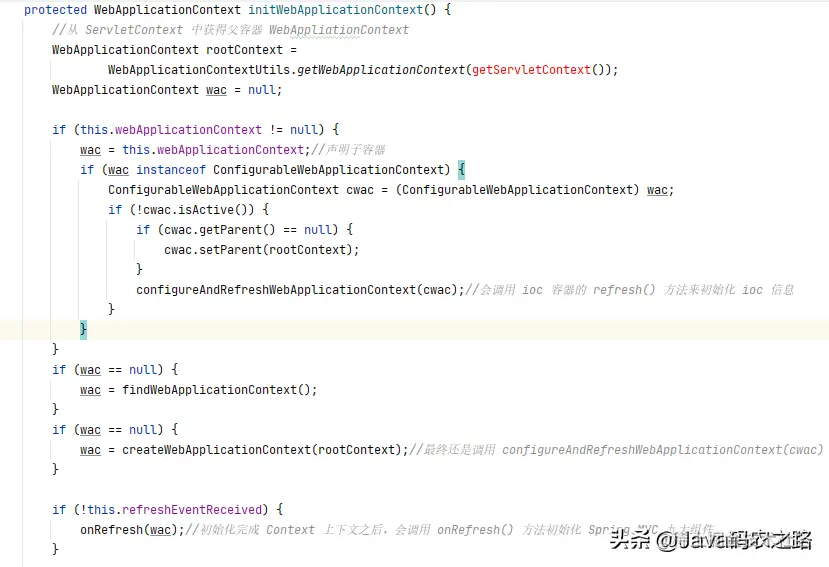 configureAndRefreshWebApplicationContext(cwac) 方法,而这个方法最终在设置一些基本容器标识信息之后会去调用 refresh()方法,也就是初始化 ioc 容器。