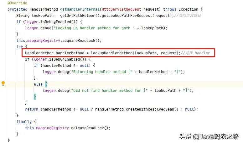 这个方法本身也没有什么逻辑,其主要的核心查找 Handler 逻辑在 lookupHandlerMethod 方法中,这个方法主要是为了获取一个 HandlerMethod 对象,前面的方法都是 Object,而到这里变成了 HandlerMethod 类型,这是因为 Handler 有各种类型,目前我们已经基本跟到了具体类型之下,所以类型就变成了具体类型,而如果我们看的的另一条分支线,那么返回的就会是其他对象,正是因为支持多种不同类型的 HandlerMapping 对象,所以最终为了统一执行,才会需要在获得 Hanlder 之后,DispatcherServlet 中会再次通过调用 getHandlerAdapter 方法来进一步封装成 HandlerAdapter 对象,才能进行方法的调用