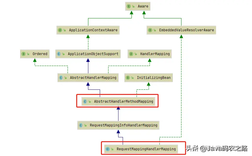 这时候如果拿捏不准我们就可以看一下类图,上面我们提到,HandlerMapper 有两个非常主要的实现类: