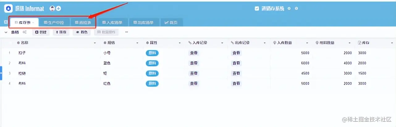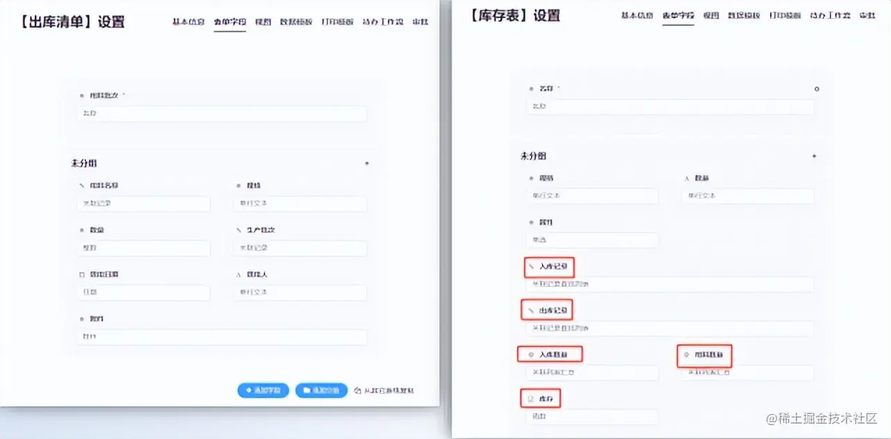 如图一所示,建立对应字段,【原料名称】的字段类型要采用【关联记录】,关联到库存表(字段类型涉及“关联”的一律采用新建,不要在已有字段上直接修改)