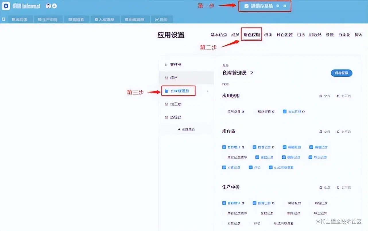 点击应用顶部,进入应用设置;【角色权限】-创建新的使用角色,给每个角色配置相应的可视/编辑权限;