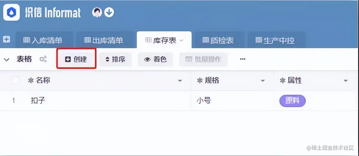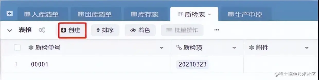 创建并进入应用后,首先我们要按照系统架构图中,创建好“入库清单、出库清单、库存表、质检表、生产中控”5张空表。