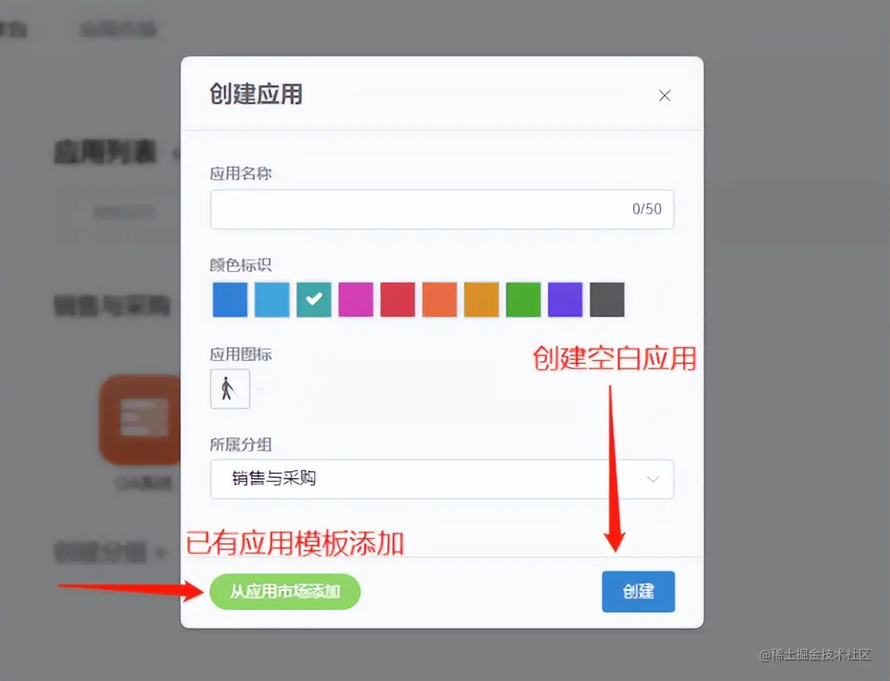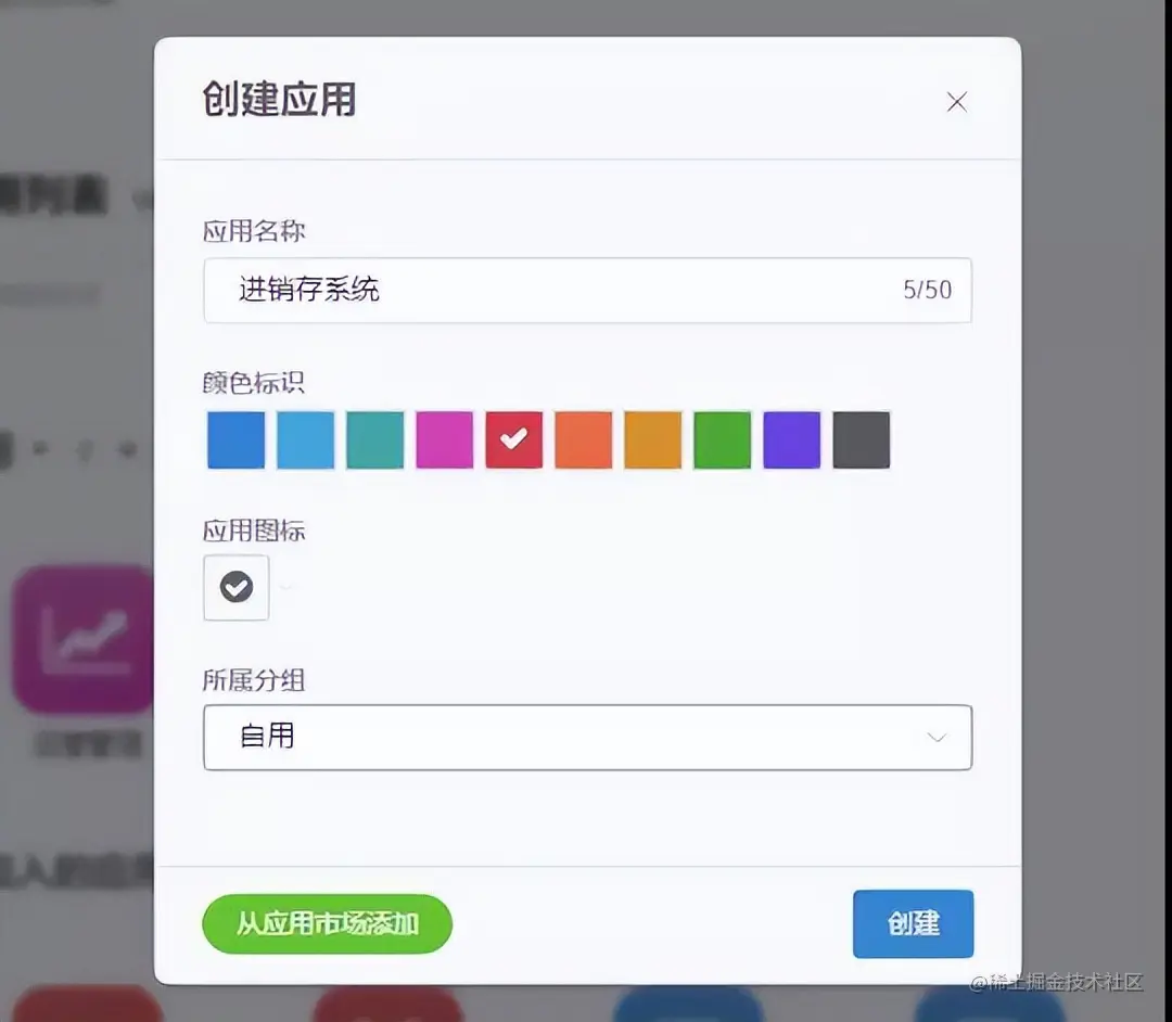首先,我们登录“织信”后台,创建团队,进入工作台后,点击中间的创建新应用,然后填写系统应用名称,选好应用颜色,再找个相应的图标,添加分组,最后点击“创建”。
