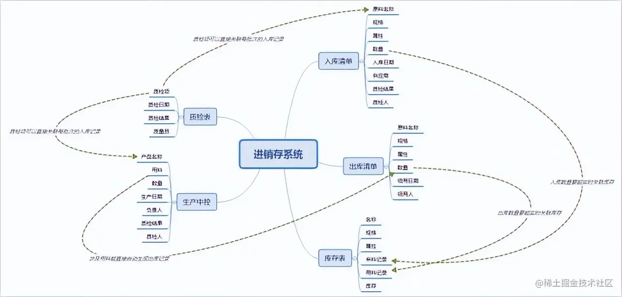 要搭建一个ERP进销存系统,整个系统流程要形成闭环则需要5张表,建立一个“属性”字段来区分【成品】和【原料】