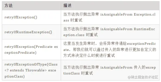 RetryerBuilder的retryIfXXX()方法用来设置**在什么情况下进行重试,总体上可以分为根据执行异常进行重试和根据方法执行结果进行重试两类。关注公众号:“码猿技术专栏”,回复关键词:“1111” 获取阿里内部Java调优手册