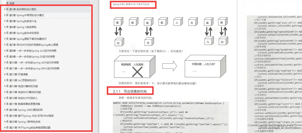 本PDF的开篇,一起畅游 Spring5 的海洋,流连于在实际开发过程中,并不要求所有代码都遵循设计原则,我们要考虑人力、时间、成本、质量,不能刻意追求完美,但要在适当的场景遵循设计原则,这体现的是一种平衡取舍,可以帮助我们设计出更加优雅的代码结构。