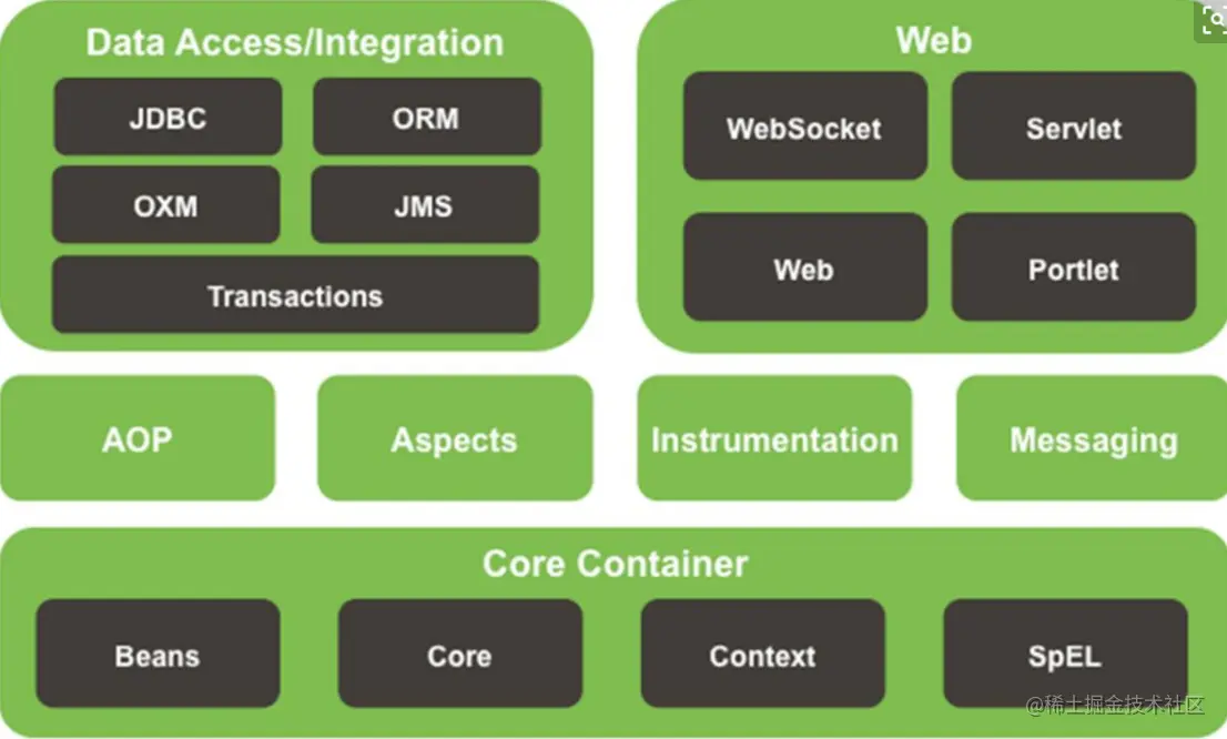 Spring 大约有 个模块,由 1300 个不同的文件构成 这些模块可以分为和 容器、 OP和设备支持、数据访问与集成、 Web 组件、通 鲍文和 成测试、 成兼容等类。 Spring块结构如下图所示。
