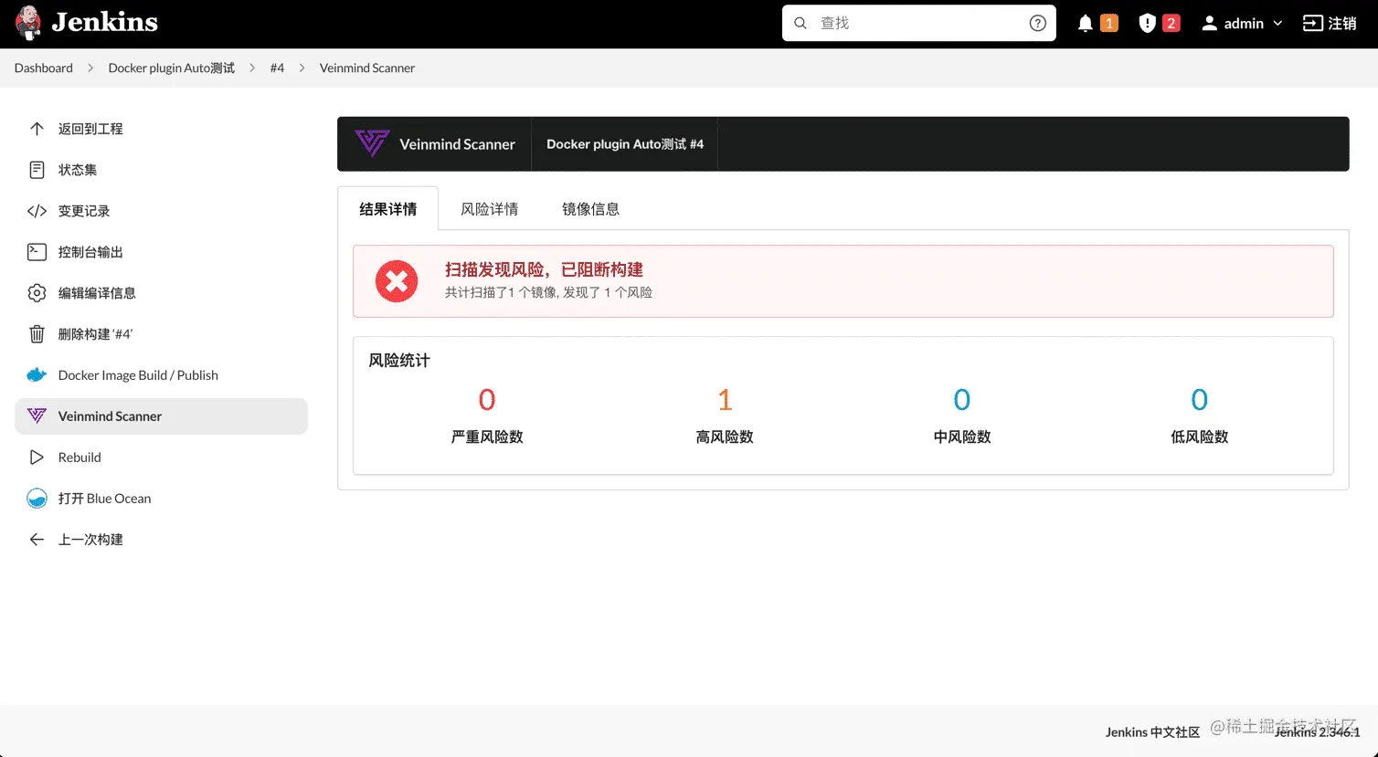 Veinmind Jenkins 插件可以帮你解决上述场景的问题。在 Jenkins安装Veinmind 插件,开启自动扫描选项,即可无需插入任何步骤,自动监听docker build行为,扫描build生成的镜像,同时支持扫描报表以及任务阻断等功能。