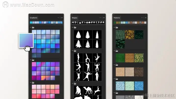 我们对预设进行了重新设计。如今的预设使用起来更简单、直观,而且布局更加井然有序。您可以轻松使用新的渐变、色板、模式、图层样式和形状。