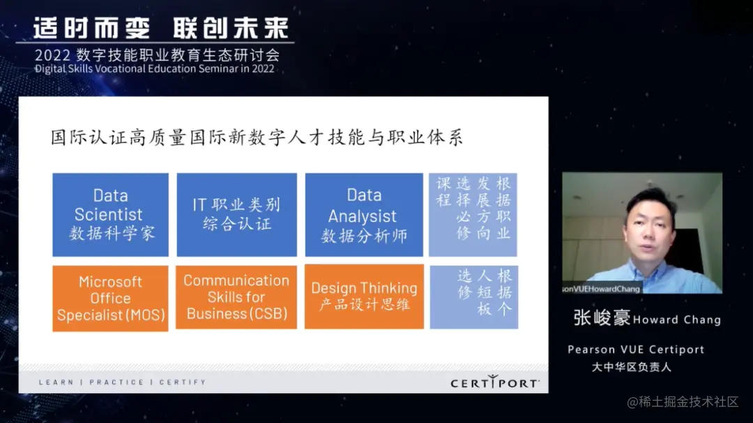 Pearson VUE Certiport大中华区负责人张峻豪先生也在会议上指出,数字化人才缺口已经成为一个全球性问题,培养出一批适应新数字化时代的人才是目前急需解决的问题。他认为应该善用国际标准来培养中国的数字化人才,培养符合市场需求的高质量标准化数字人才。