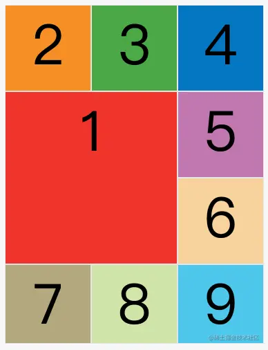 除了1号项目以外,其他项目都没有指定位置,由浏览器自动布局,这时它们的位置由容器的grid-auto-flow属性决定,这个属性的默认值是row,因此会"先行后列"进行排列。读者可以把这个属性的值分别改成column、row dense和column dense,看看其他项目的位置发生了怎样的变化。