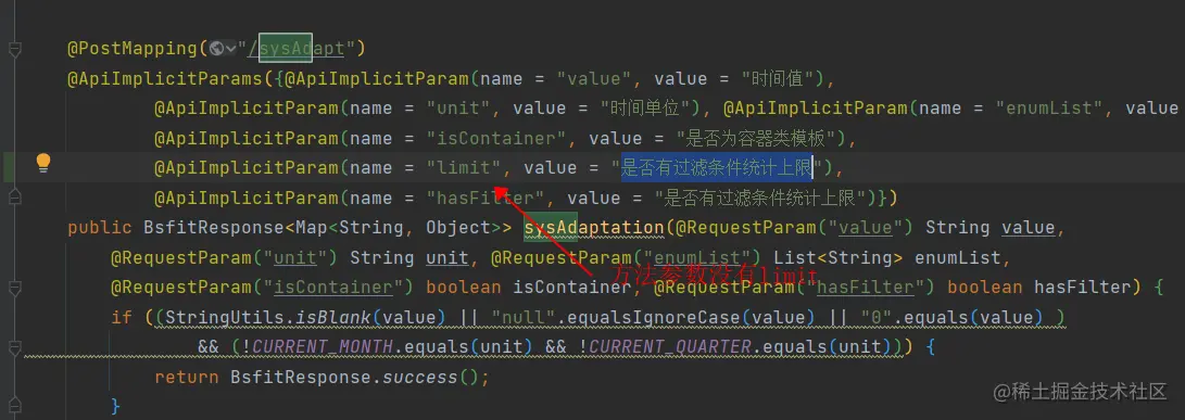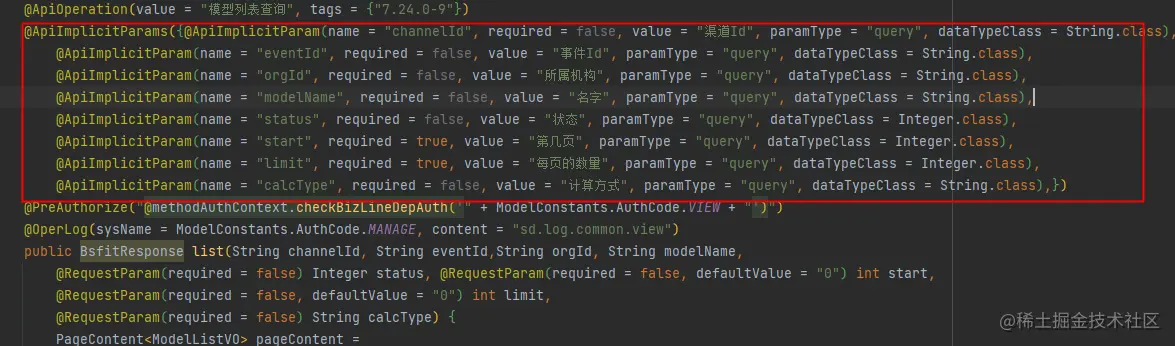 | value | 是@ApiImplicitParam注解的列表,一个ApiImplicitParam表示一个请求参数 | 是 | @ApiImplicitParams({@ApiImplicitParam(name = "channelId", required = false, value = "渠道Id")}) |