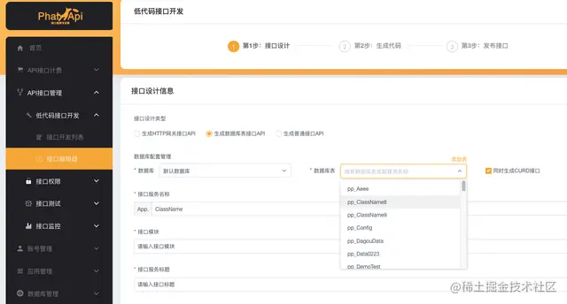 随后,你可以在线生成数据库API接口,选择数据库、选择数据库表,并进行SQL语句编写和调整、接口测试。