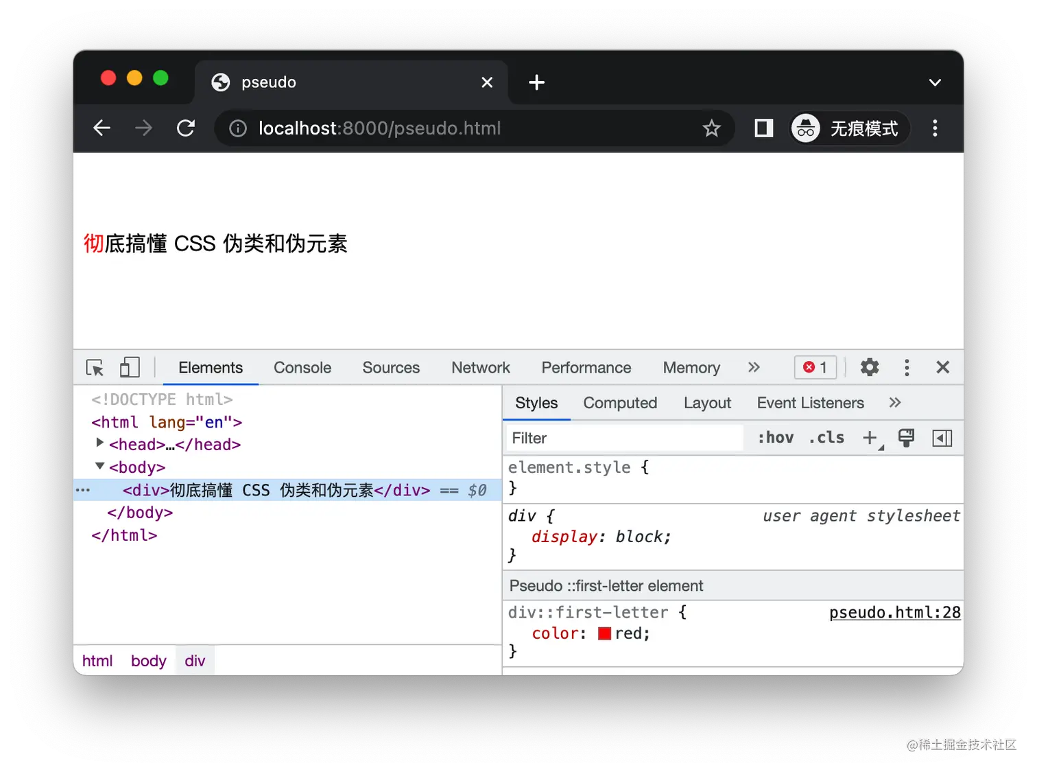 与伪类不同的是,首字并不是 div 元素的某种状态,而是浏览器创建出来的一个虚拟的元素,我们可以在上图的右下角看到 Pseudo ::first-letter element提示,相当于浏览器自动选中了「彻」字。