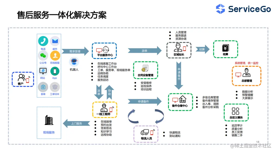 沃丰科技直接对标Salesforce,推出了一体化智能售后服务平台ServiceGo。沃丰科技ServiceGo提供领先的市场、销售、服务管理解决方案,借助低代码PaaS平台的底层架构,灵活的功能模块,可视化配置的设计理念,及沉淀下的多个行业优质解决方案,轻松满足各类管理需求,实现全流程数字化管理,提升管理效率,提高客户满意度。