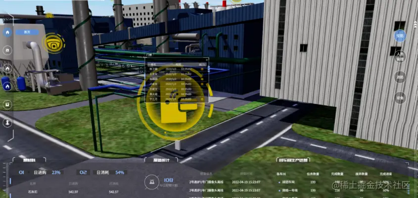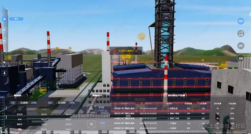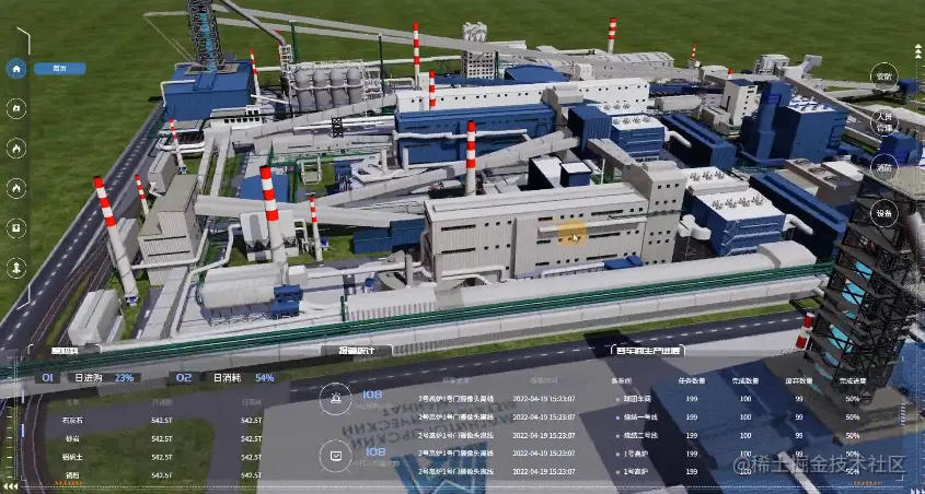 数字孪生智慧水泥厂三维可视化管理平台采用轻量化三维建模,利用数字孪生技术对厂区进行1:1三维实景展示,以三维场景为基础,2D数据面板为辅,数字化展现水泥厂各区域的建设、运行情况、安全配备、周边动态环境等情况。通过Sovit3D可视化开发平台实现可交互式的 Web 三维场景,可进行缩放、平移、旋转,场景内各设备可以响应交互事件。