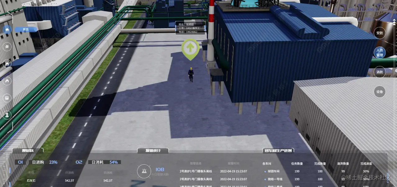 数字孪生智慧水泥厂三维可视化管理系统利用虚拟仿真技术,打造1:1的线上三维可视化水泥厂,充分发挥数据平台实现人员管理、生产状态、智能能耗、智能安防、轨迹展示、预警提示等系统功能,实现远程监控及预测。将过去全屏监控变成报警重点判识,有效降低远程值守人员双眼疲劳度,视频监控变得更聪明;集“监测、展示、预警”于一体,让生产过程的安全防范更智能。