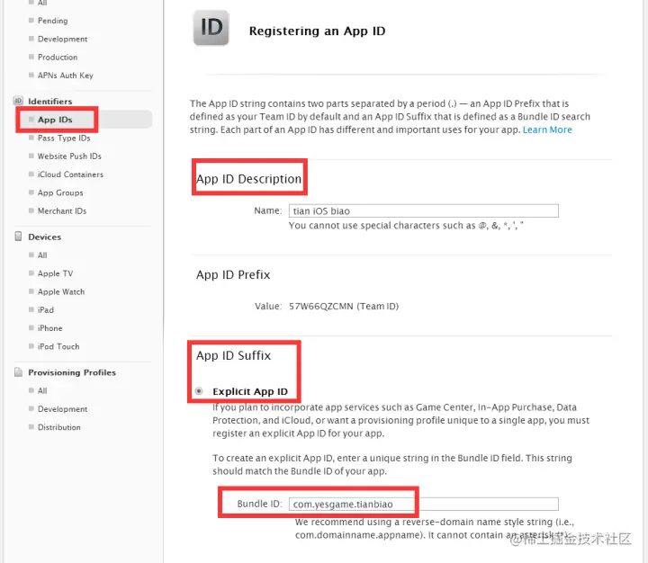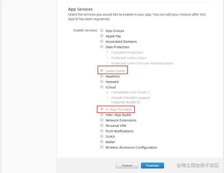 其中有两项需要你自己填: 第一项Name,用来描述你的App ID,这个随便填,没有什么限制,最好是项目名称,这样方便自己辨识(不允许中文) 第二项Bundle ID (App ID Suffix),这是你App ID的后缀,需要仔细填写。用来标示我们的 app,使它有一个固定的身份,和你的程序直接相关。填写 Explicit App ID 的格式为:com.company.appName,照着格式写,写个方便记的,后面很多地方要用到。 第三项App Services,默认会选择2项,不能修改,其它根据自己需要的服务选择上,然后点击Continue确认,下一步。
