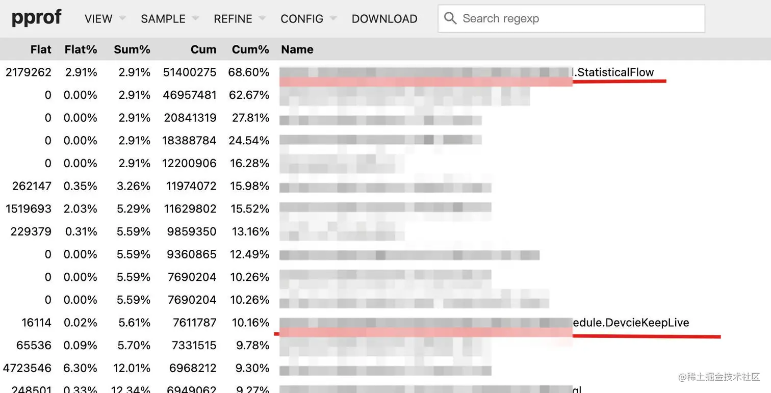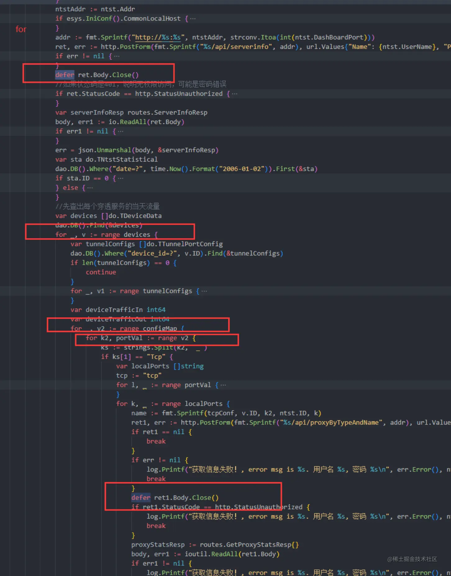 StatisticalFlow函数是用于统计流量输入输出的,每30秒执行一次,其中嵌套了多级for循环。每个循环里面还嵌套了网络请求及defer Body.CLose() 。