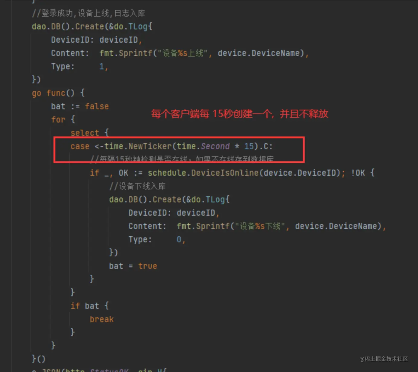 再看另外一个函数,记录设备下线日志,此处每个客户端会创建至少一个协程,并在for循环里每15秒创建一个无法回收的定时器。