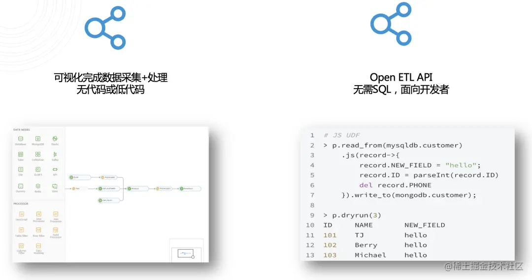 首创 Fluent ETL API:面向开发者,特别针对开源社区,无需 SQL,只需要写一段程序就可以拥有数据集成能力,完成数据开发工作。