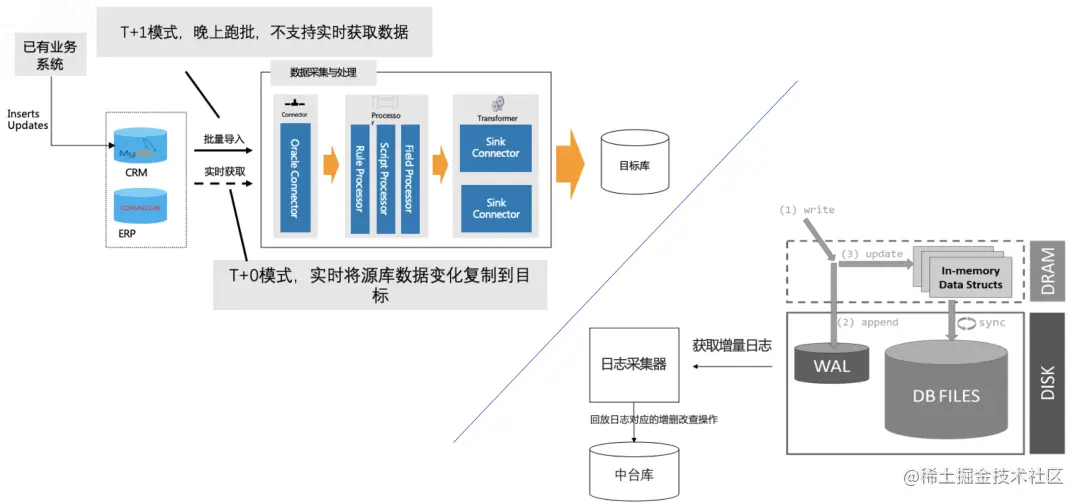 以数据源是 Oracle,数据目标是 MySQL 为例:如上图所示,写入 Oracle 的数据,最先会进入 Online Redo Log,即落入 Memory Buffer 中,这时就可以对这些数据进行挖掘了。刚写入就抓取,像这样基于数据库事件的挖掘,无疑是最实时的方式,比起轮询要快得多。