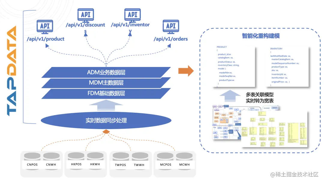 进入贴源层,构建包含企业核心业务数据的主数据层;在主数据层之上业务模型,通常是不同项目对于主数据的复用需求,这个过程中需要用到 Tapdata 的数据集成能力、数据开发能力,以及数据的中央化存储。